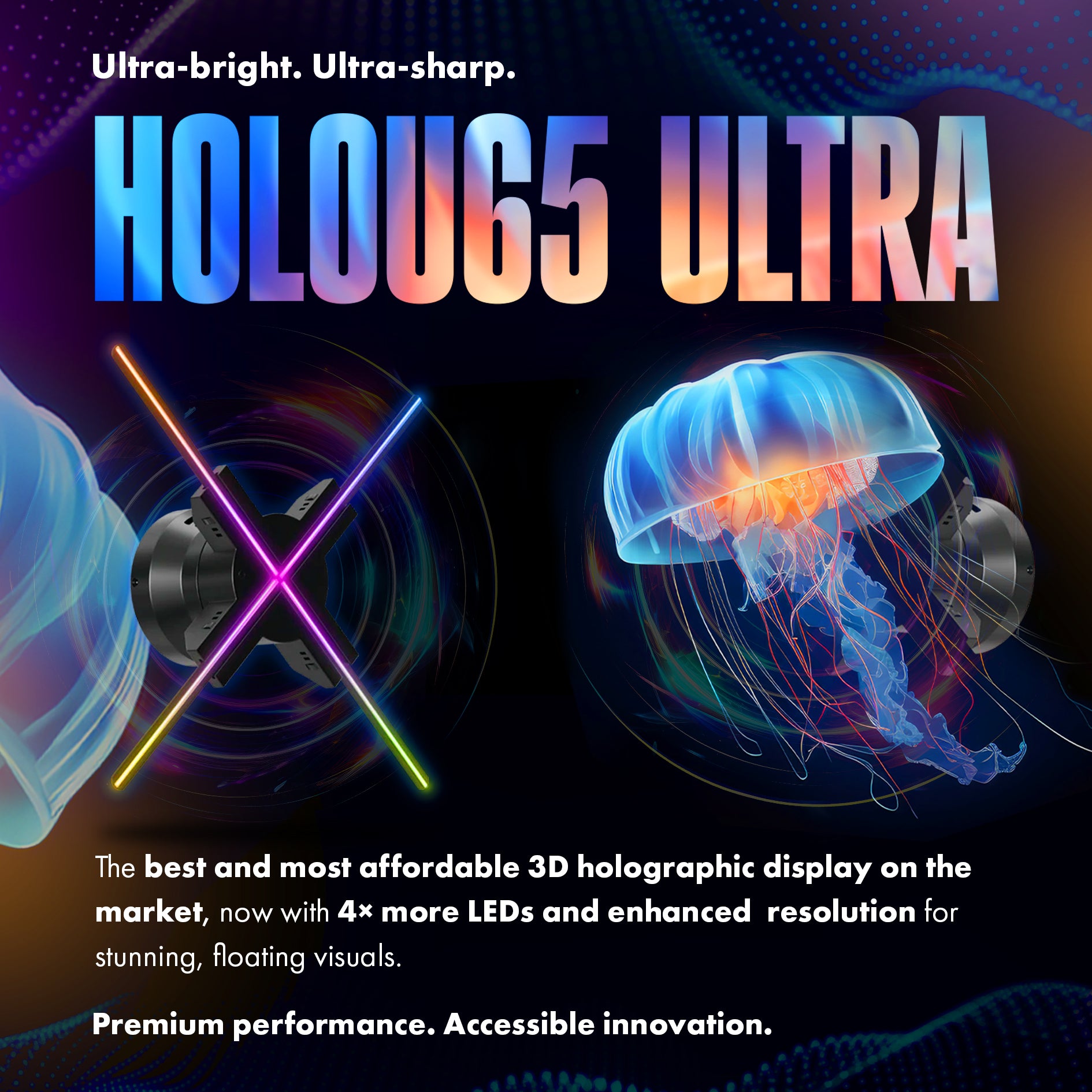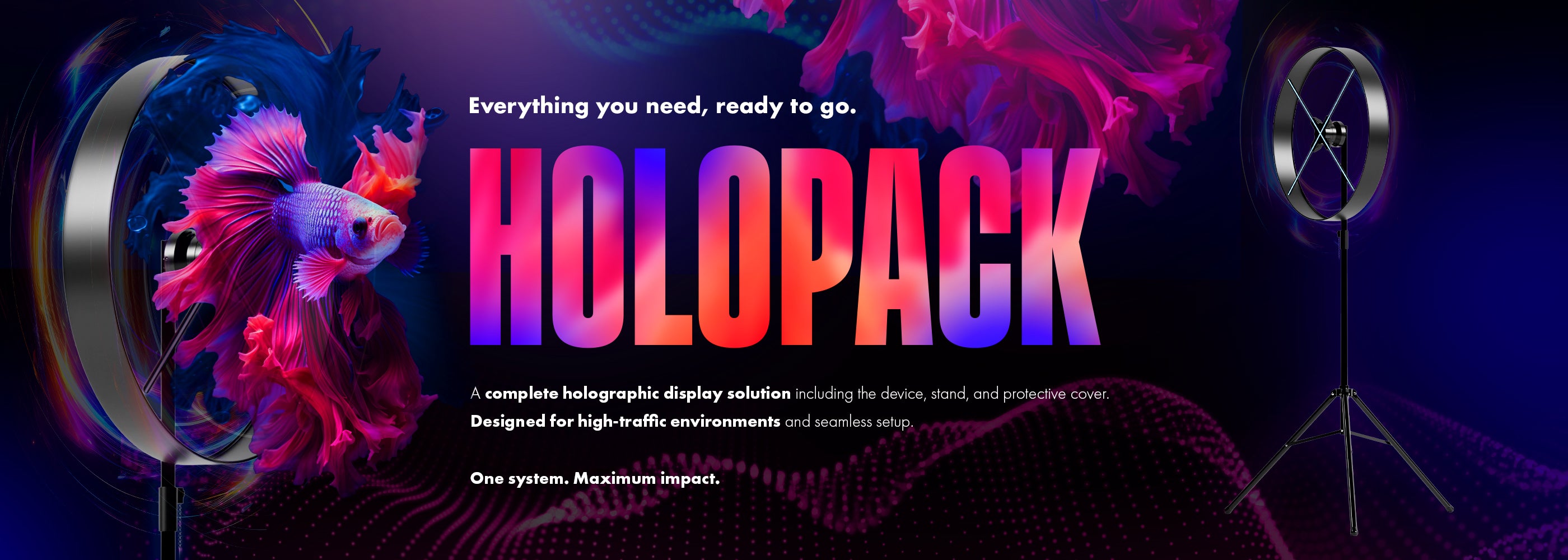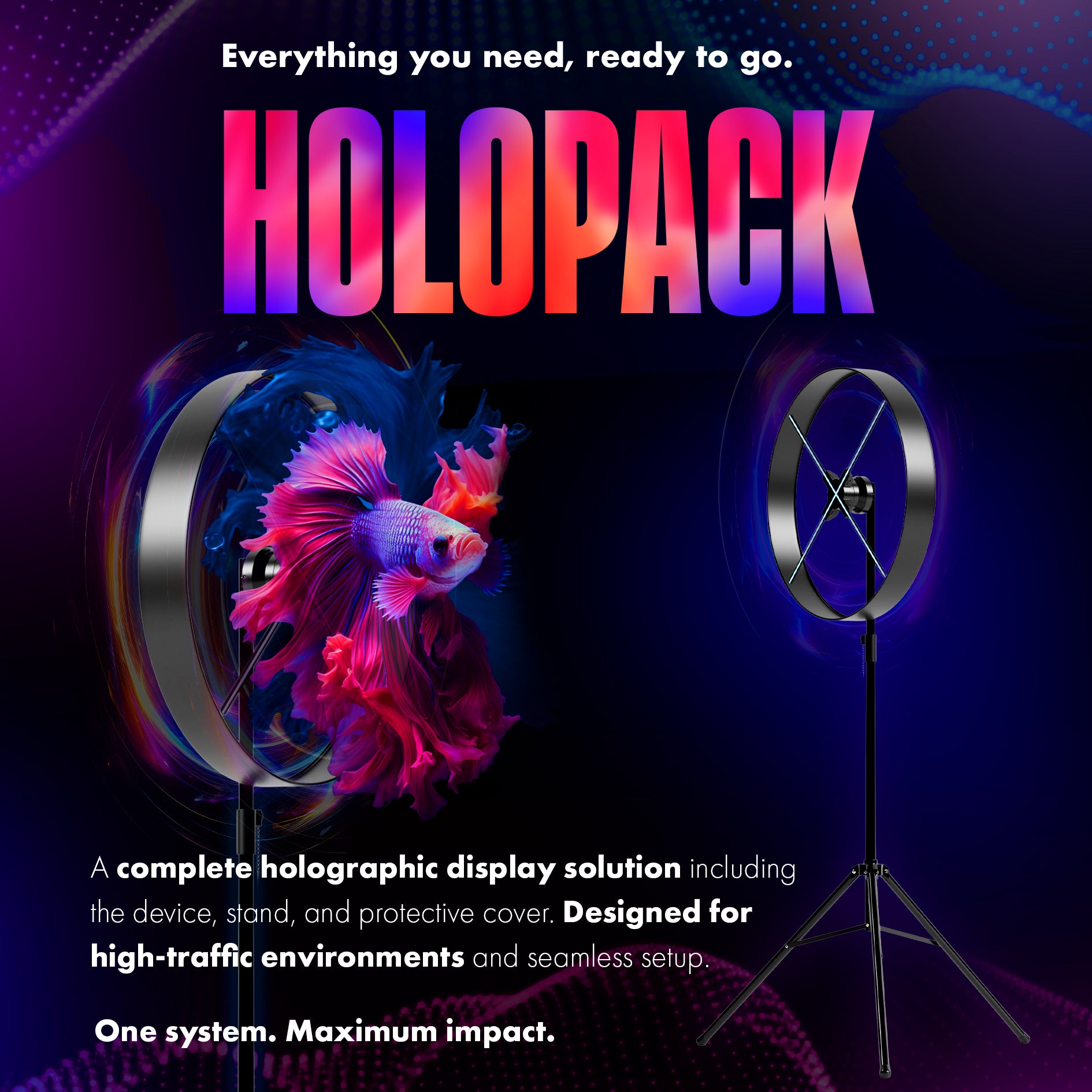 Meet the HOLOPACK — the complete holographic display solution built for instant impact. Each pack includes our latest model U65 series fan (65cm) with 1280 leds, our premium tripod stand, and a sleek protective cover — everything you need in one sleek kit.